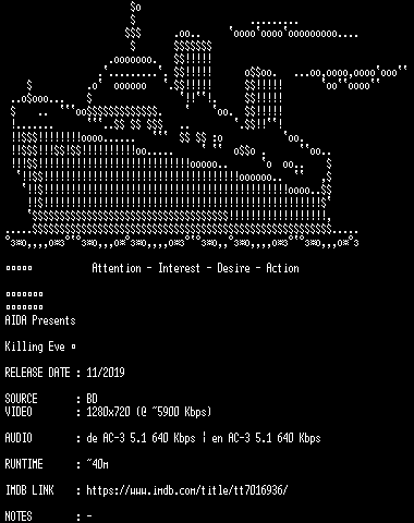 | FiLENAME: | Killing.Eve.S01E03.German.DL.DUBBED.720p.BluRay.x264-AIDA.mkv |