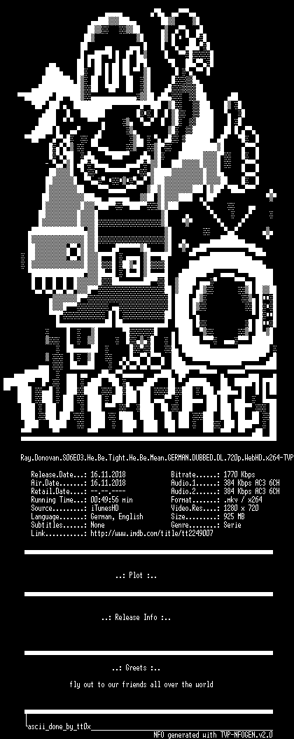 | FiLENAME: | Ray.Donovan.S06E03.He.Be.Tight.He.Be.Mean.GERMAN.DUBBED.DL.720p.WebHD.x264-TVP.mkv |