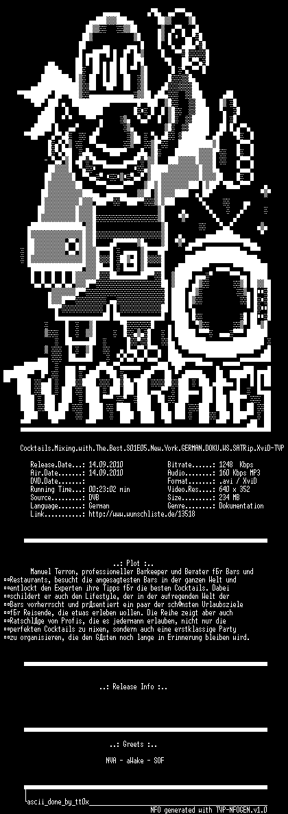 | FiLENAME: | Cocktails.Mixing.with.The.Best.S01E05.New.York.GERMAN.DOKU.WS.SATRip.XviD-TVP.avi |