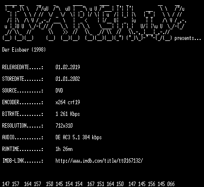 | FiLENAME: | Der.Eisbaer.1998.German.DVDRip.x264.iNTERNAL-TVARCHiV.mkv |