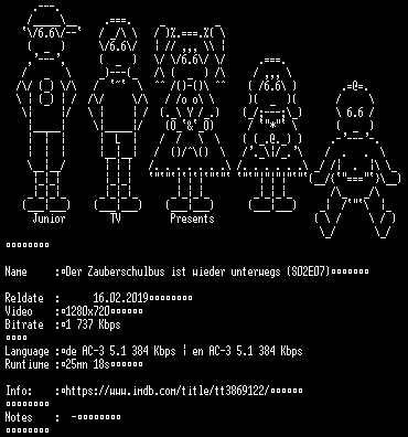 | FiLENAME: | Der.Zauberschulbus.ist.wieder.unterwegs.S02E07.German.DL.720p.WEBHD.x264-JuniorTV.mkv |