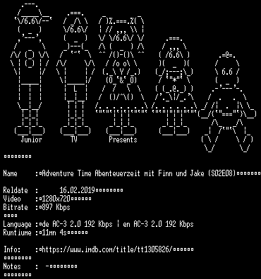 | FiLENAME: | Adventure.Time.Abenteuerzeit.mit.Finn.und.Jake.S02E08.German.DL.720p.WEBHD.x264-JuniorTV.mkv |