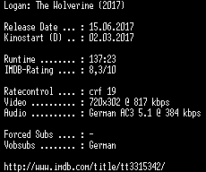 | FiLENAME: | Logan.The.Wolverine.German.2017.AC3.BDRip.x264-COiNCiDENCE.mkv |