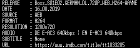 | FiLENAME: | Boss.S01E02.GERMAN.DL.720P.WEB.H264-WAYNE.mkv |