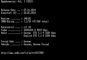 | FiLENAME: | Nymphomaniac.Vol.I.Directors.Cut.German.DL.1080p.BluRay.x264-EXQUiSiTE.mkv |