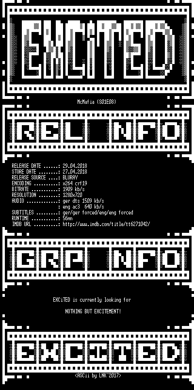 | FiLENAME: | McMafia.S01E08.German.DL.720p.BluRay.x264-EXCiTED.mkv |
