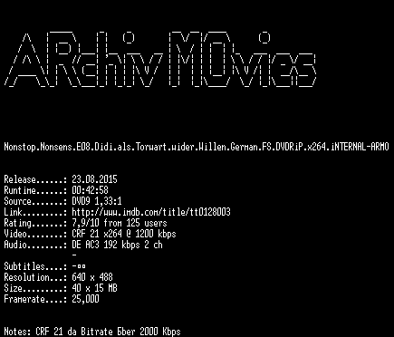 | FiLENAME: | Nonstop.Nonsens.E08.Didi.als.Torwart.wider.Willen.German.FS.DVDRiP.x264.iNTERNAL-ARMO.mkv |