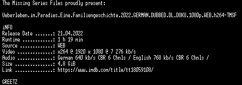 | FiLENAME: | Ueberleben.im.Paradies.Eine.Familiengeschichte.2022.GERMAN.DUBBED.DL.DOKU.1080p.WEB.h264-TMSF.mkv |