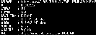 | FiLENAME: | Modern.Love.S01E05.GERMAN.DL.720P.WEBRIP.X264-WAYNE.mkv |