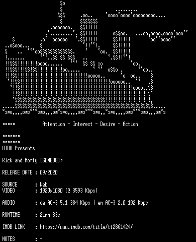 | FiLENAME: | Rick.and.Morty.S04E08.German.DL.DUBBED.1080p.WEBRip.x264-AIDA.mkv |