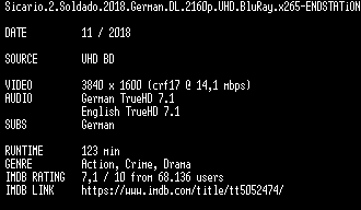 | FiLENAME: | Sicario.2.Soldado.2018.German.DL.2160p.UHD.BluRay.x265-ENDSTATiON.mkv |