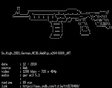 | FiLENAME: | So.High.2001.German.AC3D.WebRip.x264-GSG9_iNT.mkv |