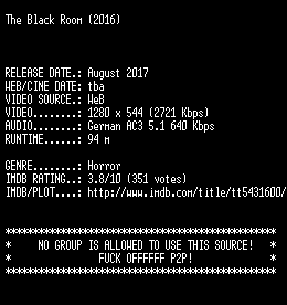 | FiLENAME: | The.Black.Room.2016.German.720p.WebHD.x264-SLG.mkv |