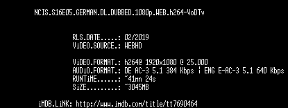 | FiLENAME: | NCIS.S16E05.GERMAN.DL.DUBBED.1080p.WEB.h264-VoDTv.mkv |