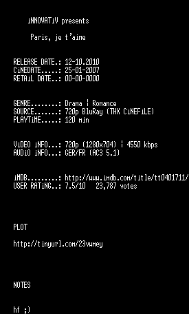 | FiLENAME: | Paris Je Taime (2006) [DL 720p BD].mkv |
