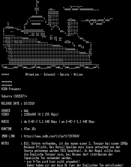 | FiLENAME: | Suburra.S02E07.German.DL.720p.WebHD.x264-AIDA.mkv |