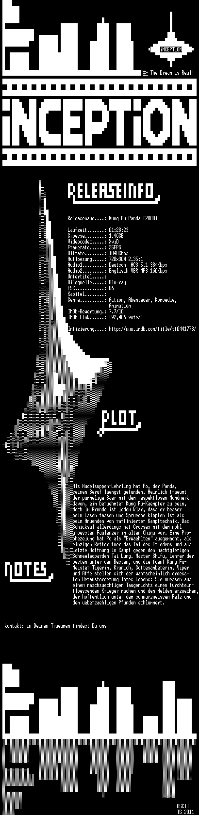 | FiLENAME: | Kung.Fu.Panda.2008.German.AC3.DL.BDRip.XviD-iNCEPTiON.avi |