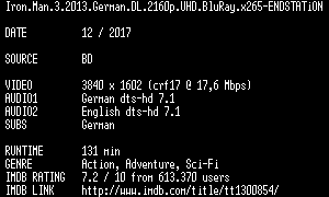 | FiLENAME: | Iron.Man.3.2013.German.DL.2160p.UHD.BluRay.x265-ENDSTATiON.mkv |