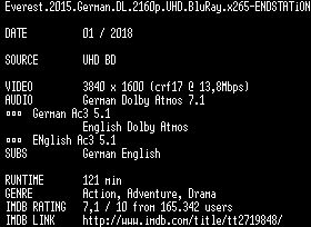 | FiLENAME: | Everest.2015.German.DL.2160p.UHD.BluRay.x265-ENDSTATiON.mkv |