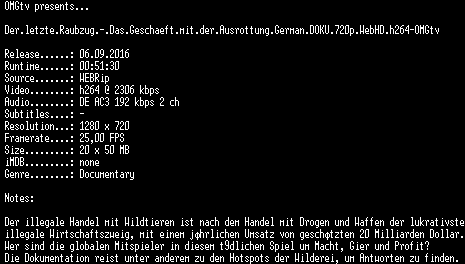 | FiLENAME: | Der.letzte.Raubzug.-.Das.Geschaeft.mit.der.Ausrottung.German.DOKU.720p.WebHD.h264-OMGtv.mkv |
