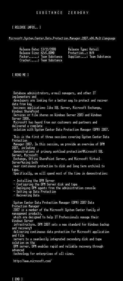 | FiLENAME: | Microsoft System Center Data Protection Manager 2007 x86 Multilanguage-Substance.rar |