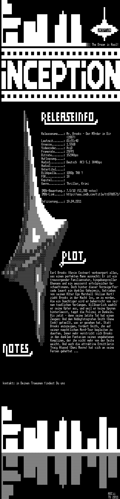 | FiLENAME: | Mr.Brooks.Der.Moerder.in.dir.2007.German.AC3.HDRip.XviD-iNCEPTiON.avi |