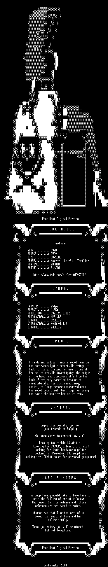 | FiLENAME: | Hardware.1990.WS.DVDRip.XViD.iNT-EwDp.avi |