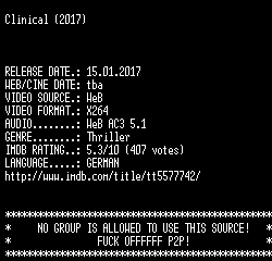 | FiLENAME: | Clinical.2017.German.720p.WebHD.x264-SLG.mkv |