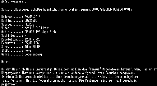 | FiLENAME: | Xenius.-.Koerpergeruch.Die.heimliche.Kommunikation.German.DOKU.720p.WebHD.h264-OMGtv.mkv |