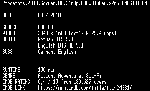 | FiLENAME: | Predators.2010.German.DL.2160p.UHD.BluRay.x265-ENDSTATiON.mkv |
