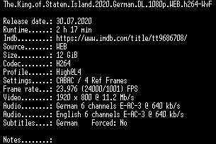 | FiLENAME: | The.King.of.Staten.Island.2020.German.DL.1080p.WEB.h264-WvF.mkv |
