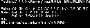 | FiLENAME: | The.Mick.S01E17.Der.Eindringling.GERMAN.DL.1080p.WEB.H264-OCA.mkv |