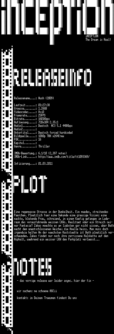 | FiLENAME: | Hush.2009.German.AC3.HDRip.XviD-iNCEPTiON.avi |