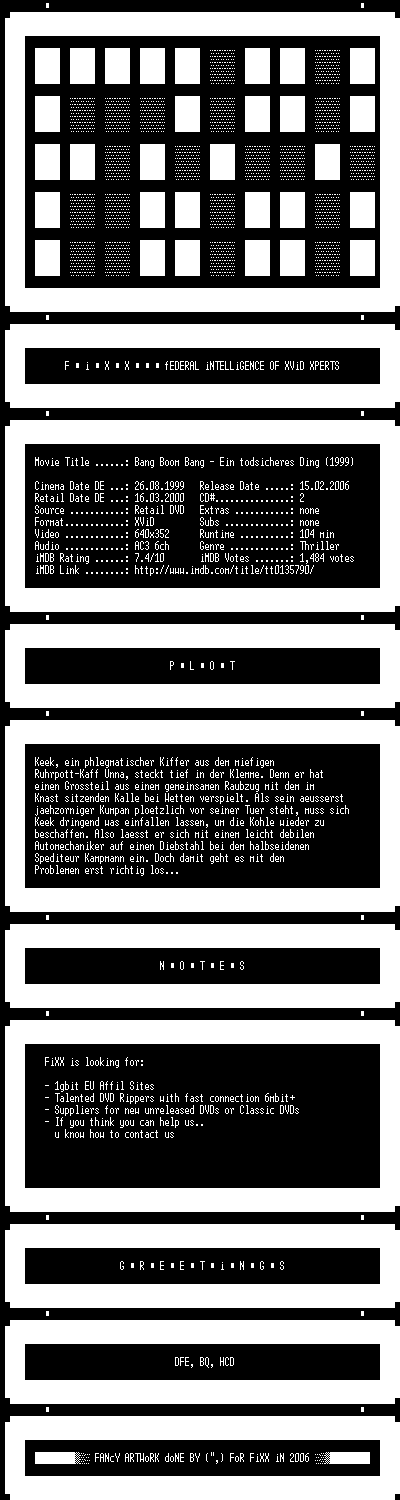 | FiLENAME: | Bang.Boom.Bang.Ein.todsicheres.Ding.German.1999.AC3.DVDRiP.XViD.iNTERNAL-FiXX.CD2.avi |
