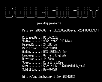 | FiLENAME: | Paterson.2016.German.DL.1080p.BluRay.x264-DOUCEMENT.mkv |