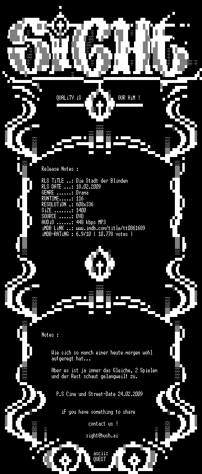 | FiLENAME: | Die Stadt der Blinden (2008) [GER-AC3 WS DVD] CD1.avi |