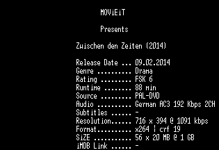 | FiLENAME: | Zwischen.den.Zeiten.GERMAN.2014.AC3.DVDRip.x264-MOViEiT.mkv |