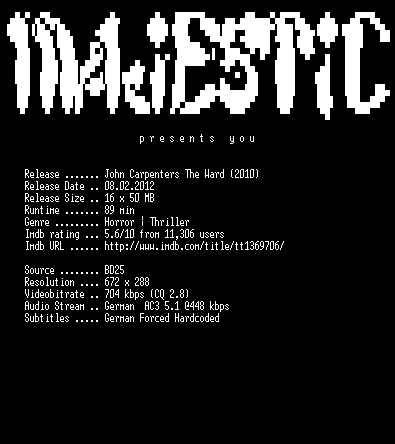 | FiLENAME: | John.Carpenters.The.Ward.2010.German.AC3.BDRip.XviD-MAJESTiC.avi |