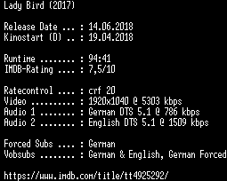 | FiLENAME: | Lady.Bird.2017.German.DTS.DL.1080p.BluRay.x264-COiNCiDENCE.mkv |