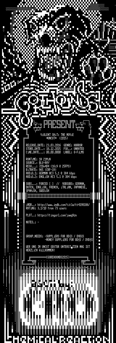 | FiLENAME: | Violent.Shit.The.Movie.GERMAN.2015.DL.BDRiP.x264-GOREHOUNDS.mkv |