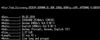 | FiLENAME: | Star.Trek.Discovery.S02E04.GERMAN.DL.HDR.1080p.WEBRip.x265.iNTERNAL-EiSBOCK.mkv |