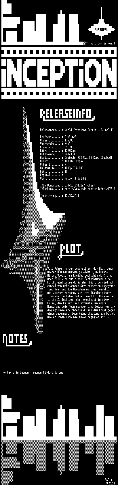 | FiLENAME: | World.Invasion.-.Battle.Los.Angeles.2011.German.AC3D.5.1.HDRip.XviD.iNTERNAL-iNCEPTiON.avi |