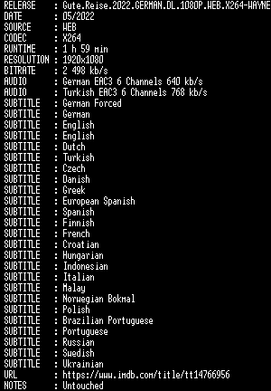 | FiLENAME: | Gute.Reise.2022.GERMAN.DL.1080P.WEB.X264-WAYNE.mkv |