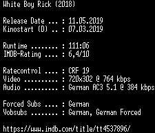 | FiLENAME: | White.Boy.Rick.German.2018.AC3.BDRip.x264-COiNCiDENCE.mkv |