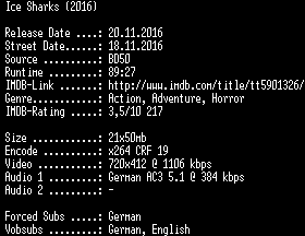| FiLENAME: | Ice.Sharks.Der.Tod.hat.rasiermesserscharfe.Zaehne.German.2016.AC3.BDRip.x264-SPiCY.mkv |
