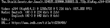 | FiLENAME: | The.Shield.Gesetz.der.Gewalt.S04E05.GERMAN.DUBBED.DL.720p.BluRay.x264-OCA.mkv |