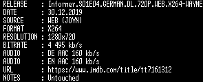 | FiLENAME: | Informer.S01E04.GERMAN.DL.720P.WEB.X264-WAYNE.mkv |