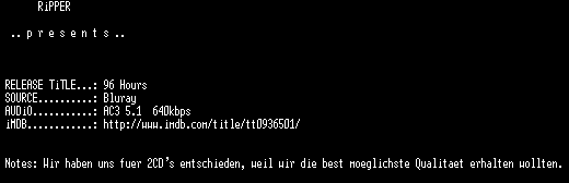 | FiLENAME: | 96 Hours (Taken) (2008) [GER WS BD] CD2.avi |