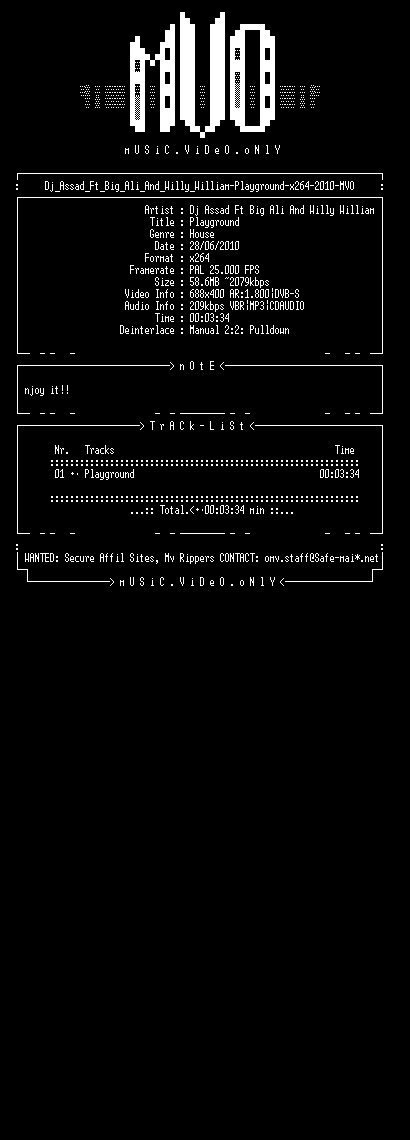 | FiLENAME: | Dj_Assad_Ft_Big_Ali_And_Willy_William-Playground-x264-2010-MVO.mkv |