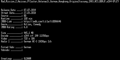 | FiLENAME: | Mad.Mission.2.Heisses.Pflaster.Unterwelt.German.Hongkong.Originalfassung.1983.AC3.BDRiP.x264-SPiCY.mkv |